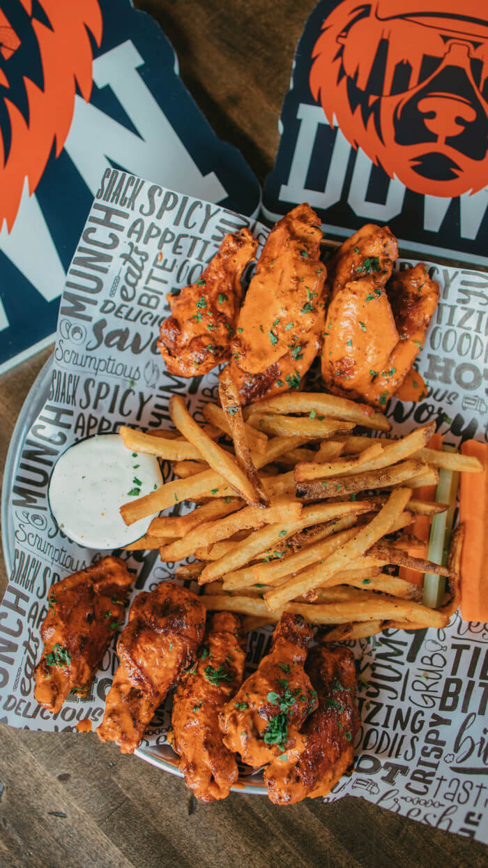 Flavors Options: The All American (BBQ), Lemon Pepper (dry rub), Garlic Parmesan, The Gringo (mild), The Belmont Cragin (garlic buffalo), The Black Label (valentina), The Korean (sweet n spicy), The Mexican (buffalo), Pineapple Express (Pina Habanero), The Bandit (spicy dry rub), and Ghost Pepper Buffalo